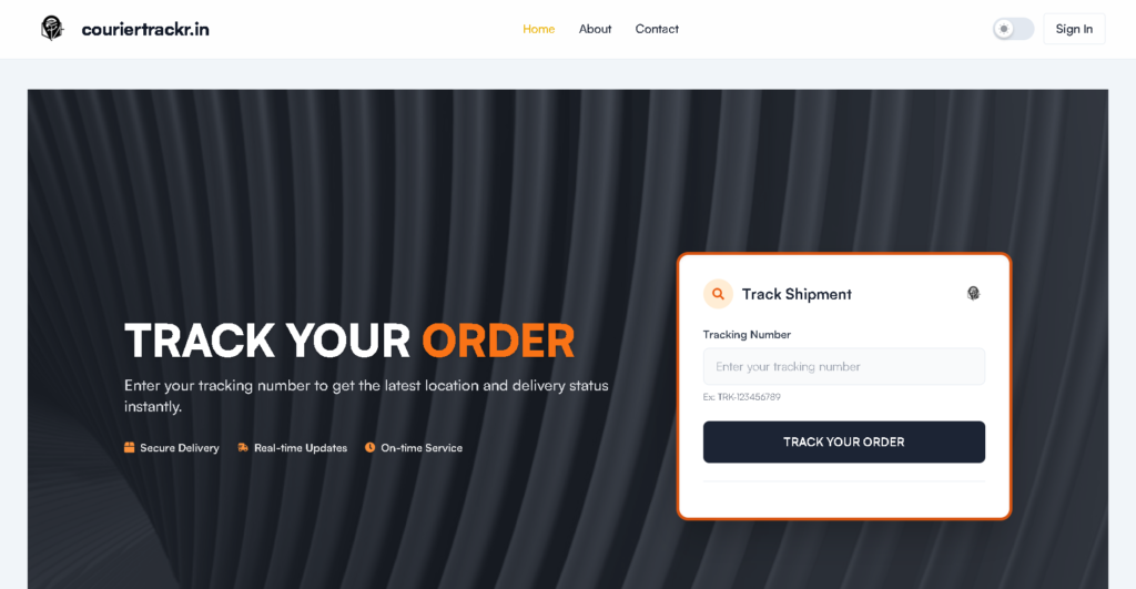 CourierTrackr is a custom-built tracking management platform designed to allow administrators to generate tracking IDs and update shipment statuses dynamically. Users can search their tracking ID to view real-time updates including location, estimated delivery time, and shipment details.